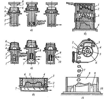 Рис. 4.11. Схемы способов уплотнения литейных форм при машинной формовке Для достижения равномерной плотности формовочной смеси в опоке используют многоплунжерные прессовые колодки (рис. 4.11, б). При прессовании стол 4 машины движется в сторону многоплунжерной прессовой колодки 1. Вследствие различной степени сопротивления формовочной смеси в форме плунжеры 3 под действием давления масла на поршень 2 прессуют находящиеся под ним участки формы независимо от соседних. Уплотнение формовочной смеси встряхиванием (рис. 4.11, в) осуществляют при подаче сжатого воздуха при давлении 0, 5...0, 8 МПа в нижнюю часть цилиндра 1, в результате чего встряхивающий поршень 2 поднимается на высоту 25...80 мм. При этом впускное отверстие 10 перекроется боковой поверхностью поршня, а нижняя его кромка откроет выхлопные окна 7, воздух выйдет в атмосферу. Давление под поршнем снизится, и стол 3 с укрепленной на нем модельной плитой 4 упадет на торец цилиндра 8. Скорость стола, а следовательно, и скорость модельной плиты упадут до нуля, в то время как формовочная смесь в опоке 5 и наполнительной рамке 6, продолжая двигаться вниз по инерции, уплотняется. В момент, когда канал 9 встряхивающего поршня окажется против отверстия 10 встряхивающего цилиндра, сжатый воздух снова войдет в полость встряхивающего цилиндра. Это повлечет за собой новый подъем встряхивающего стола и новый удар его о торец и т.д. Встряхивающий стол обычно совершает 120...200 ударов в минуту. В результате повторных ударов происходит уплотнение формовочной смеси в опоке. При этом слои формовочной смеси, лежащие у модельной плиты, будут иметь большую плотность, чем слои, лежащие в верхней части формы. Встряхиванием уплотняют формы высотой до 800 мм. Для уплотнения верхних слоев формы встряхиванием совмещают с прессованием. Это обеспечивает высокую и равномерную плотность форм. Уплотнение формовочной смеси пескометом (рис. 4.11, г) осуществляют рабочим органом пескомета - метательной головкой, выбрасывающей пакеты смеси на рабочую поверхность модельной плиты. В стальном кожухе 4 метательной головки вращается закрепленный на валу б электродвигателя ротор 5 с ковшом 2. Формовочная смесь подается в головку 1 непрерывно ленточным конвейером 3 через окно в задней стенке кожуха. При вращении ковша (1000...1200 об/мин) формовочная смесь собирается в пакеты 7 и центробежной силой выбрасывается через выходное отверстие в опоку 8. Попадая на модель 9 и модельную плиту 10, смесь уплотняется за счет кинетической энергии равномерно по высоте опоки. Метательную головку равномерно перемещают над опокой. Пескомет является высокопроизводительной машиной, поэтому его применяют для уплотнения крупных литейных форм. Управление работой пескомета автоматизировано. Пленочно-вакуумную формовку (рис. 4.11, д) осуществляют в следующей последовательности: модельную плиту 1 с моделью 2 накрывают разогретой полимерной пленкой толщиной не более 0, 1 мм. Вакуумным насосом в воздушной коробке 7 создают вакуум 2, 6...5, 2 МПа. Пленка 6 плотно прижимается к модели и модельной плите. На модельную плиту устанавливают опоку 3, которую заполняют сухим кварцевым песком 5, уплотняют его с помощью вибрации и выравнивают открытую верхнюю поверхность опоки. На верхнюю поверхность накладывают разогретую полимерную пленку 4, которая за счет разрежения (4...6 МПа) п