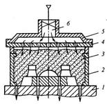 Рис. 4.7. Шаблонная формовка Рис. 4.8. Сборка формы станины в кессоне Формовку в кессонах применяют при изготовлении крупных отливок массой до 200 т. На рис. 4.8 показана форма станины, собранная в механизированном кессоне, который смонтирован на бетонном основании 7. Дно его выложено чугунными плитами 4. Две неподвижные стенки 1 и 8 также облицованы металлическими плитами. Противоположные чугунные стенки 3 и 6 передвигаются с помощью червячного редуктора 2, приводимого в действие электродвигателем, что позволяет изменять внутренние размеры кессона. Форму собирают из стержней - блоков 5, изготовленных из жидких самотвердеющих смесей. Литниковую систему изготовляют из керамических огнеупорных трубок. Верхнюю полуформу 10 устанавливают по центрирующим штырям 9 и прикрепляют к кессону болтами. Формовку в стержнях применяют в массовом и крупносерийном производствах при изготовлении отливок сложной конфигурации. На рис. 4.9 приведен пример формовки в стержнях цилиндра двигателя с воздушным охлаждением. Форма для отливки цилиндра двигателя с воздушным охлаждением собрана из шести стержней. Сборку формы производят в горизонтальном положении. В стержень 1 вкладывают стержень 2, затем стержни 3, 4, 5 и 6. Собранную форму скрепляют. Формовку с использованием жидко-стекольных смесей применяют при изготовлении отливок массой до 40 т в серийном и единичном производствах. При формовке на модель слоем 50...70 мм наносят слой жидкостекольной формовочной смеси, остальной объем опоки заполняют наполнительной формовочной смесью и уплотняют. После изготовления полуформы модели извлекают. Полуформы накрывают зонтом, под который под давлением 0, 2...0, 3 МПа подводится углекислый газ, обеспечивающий быстрое равномерное отверждение формы (рис. 4.9.1).