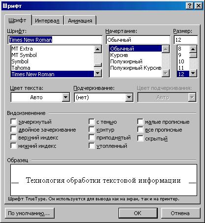 Times New Roman – как правило используется в качестве основного шрифта текста в книгах, публикациях, газетных статьях. Является наиболее легким для чтения благодаря засечкам в нижних и верхних частях символов: глаз четко улавливает строку текста. Arial – в основном используется для заголовков в различных материалах. Размер шрифта – количественная величина в пунктах (пт). Для большинства документов стандартного формата (А4 - машинописная страница) применяется размер 14 пт. Такой размер шрифта является наиболее легко читаемым при данном формате бумаги. Для других документов меньшего формата используются размеры шрифтов 12 и 10 пт. Следует также отметить, что размер шрифта также зависит от гарнитуры шрифта. Так текст, набранный шрифтом Times New Roman 14 пт будет визуально одинаково по размеру смотреться с текстом, который набран шрифтом Arial 12 пт. Полужирное, курсивное и подчеркнутое начертание– способ выделения текста в рамках одного шрифта. Для установления текущего форматирования текста необходимо установить необходимые параметры на панели инструментов Форматирование как это уже было рассмотрено выше и начать вводить текст. Если необходимо изменить оформление иже набранного текста необходимо: 1. Выделить текст. 2. Настроить их форматирование с помощью панели Форматирование как это уже было рассмотрено. Другим способом изменения форматирования является работа с диалогом Шрифт, в котором можно настроить другие параметры форматирования символов, установка которых иногда требуется Для изменения форматирования текста с помощью диалога необходимо: 1. Выделить текст. Фор м ат ® Шрифт ….