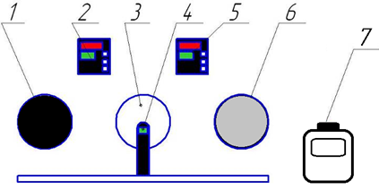 Рисунок 1 - Схема экспериментальной установки. 1 – мишень, окрашенная в черный цвет, 2 – измеритель температуры мишеней, 3 – мишень, окрашенная в белый цвет, 4 – беспроводной ИК пирометр, 5 – измеритель температур мишеней, 6 - мишень с полированной поверхностью, 7 – Автотрансформатор (ЛАТР)