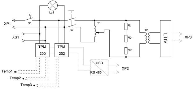 Рисунок 3 – электрическая схема стенда XP1 – вилка для подключения стенда к сети 220 В / 50 Гц, заземление обязательно! XP2, XP3 – вилка USB для подключения к компьютеру (протокол USB 1.1) XS1 – розетка для подключения дополнительных приборов к сети 220 В / 50 Гц, располагается сзади стенда в белом коробе. Максимальная мощность 1, 5 кВт. Используется для подключения компьютера (ноутбука) при работе со стендом. S1 – автоматический однофазный выключатель, мощность 6А (10А, 16А или 25А) в зависимости от модели стенда. Установлен на лицевой панели стенда. S2 – выключатель подачи питания к автоматическому трансформатору со встроенным индикатором (светодиод). На стенде расположен в лицевой панели с обозначением ВК1. La1 – индикаторная лампа, загорается при подаче к стенду питания 220В с помощью автоматического выключателя S1. T1 – автоматический автотрансформатор подает регулируемое напряжение (0-220В) к нагревателям мишеней стенда. Мощность 500 Вт, максимальный ток 2А. T2 – понижающий трансформатор (220 – 9 В) для измерения напряжения на мишенях, В R1, R2, R3 – нагреватели мишеней, общее сопротивление 78 Ом. ТРМ 200 и 202 (200 в зависимости от комплектации) – измерители сигналов с термопар. Передача данных осуществляется по протоколу RS 485 c последующим преобразованием (преобразователь АС-4) и передачи данных в компьютер по протоколу USB. Temp1…3 – термопары, установленные на обратной стороне мишеней для измерения температуры поверхности.