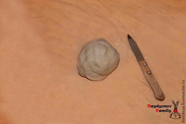 1. Приступаем. Сначала возьмем небольшой кусок глины и положим его на любую плотную ткань