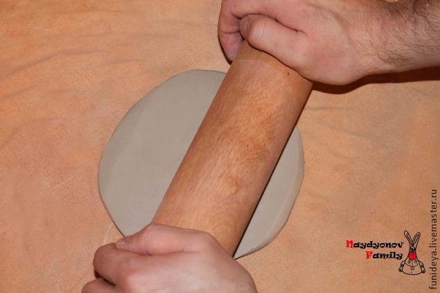 2. При помощи скалки раскатываем глину в тонкий равномерный пласт толщиной 5 мм