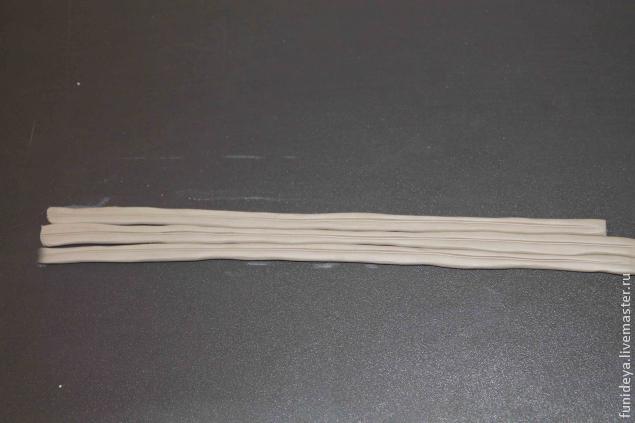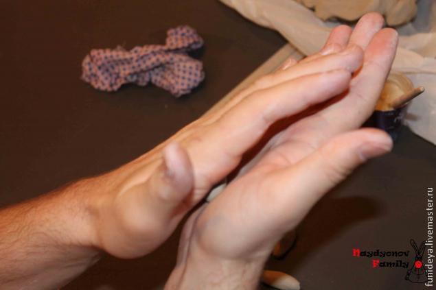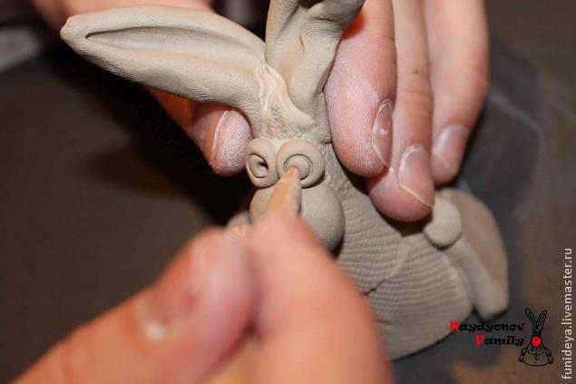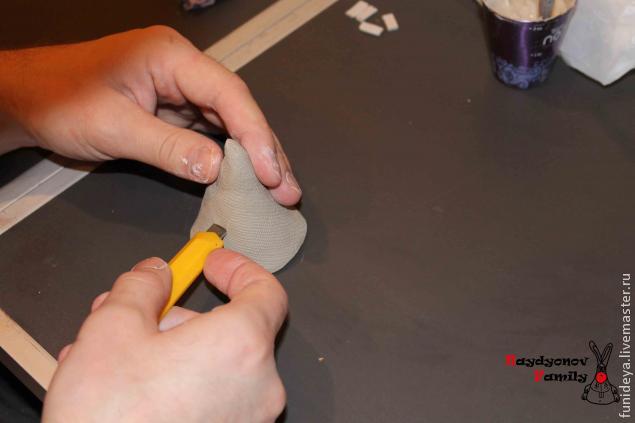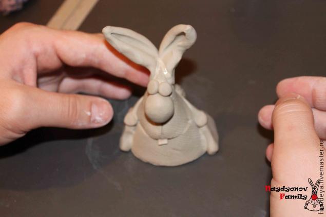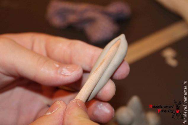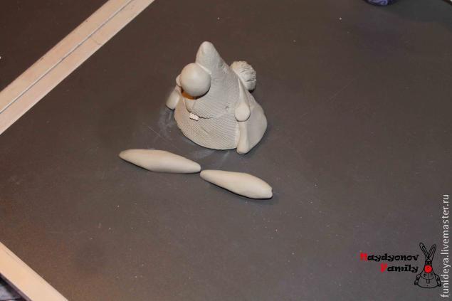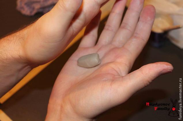 20. Приступаем к ушам. Для этого берем два одинаковых куска глины и ладонями придаем им форму, как на фото