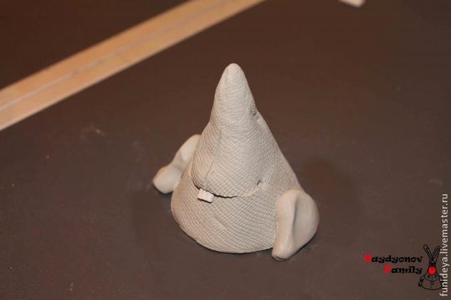 15. Крепим наши лапки при помощи шликера по бокам у зайца