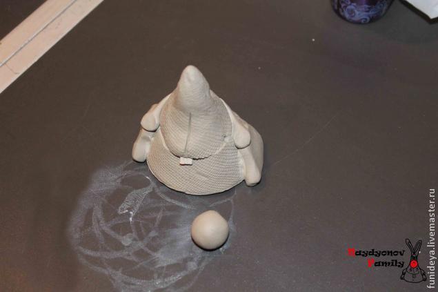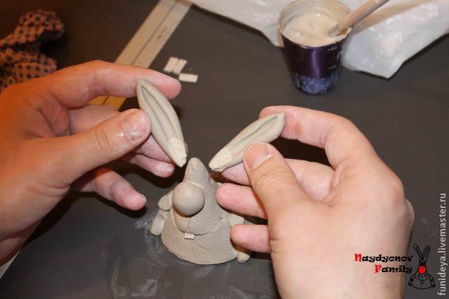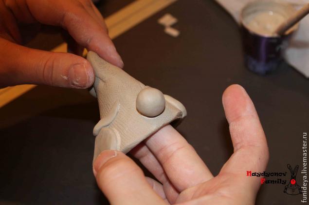 17. Делаем нос зайца, для этого катаем шарик и крепим к верхней части туловища. Не забываем про шликер, он у нас служит цементом)))