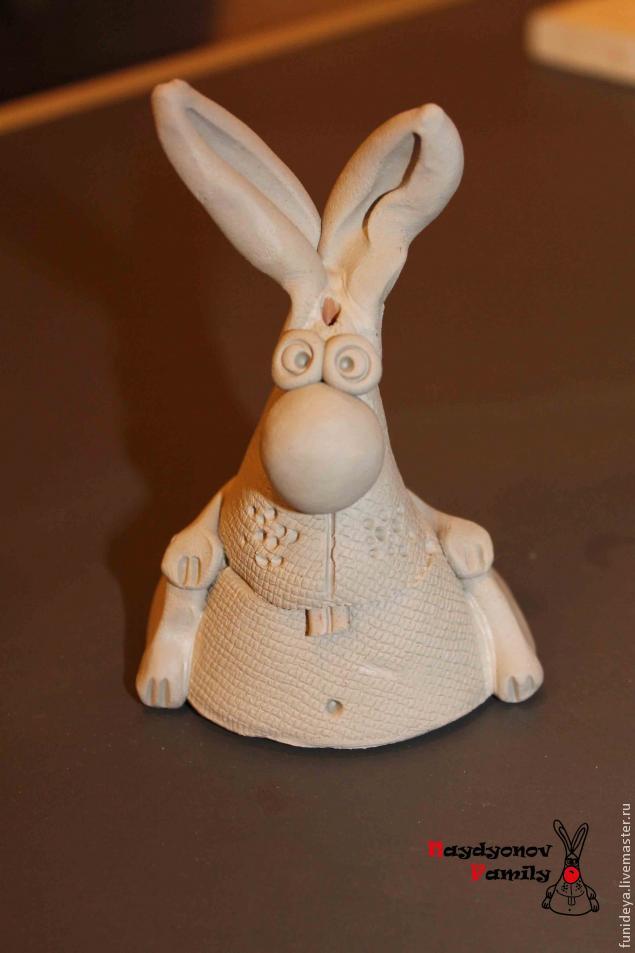 Теперь наш заяц должен полностью высохнуть, это примерно один - два дня, после этого его обжигают в муфельной печи при температуре 1000 градусов. Только после обжига мы сможем приступить к росписи сувенира. Тут уж можно фантазировать по разному. Мы вот, например, любим использовать глазурь и акриловые краски.