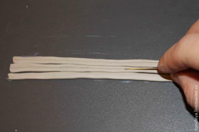 Примечание: для того, чтобы сделать зубы, нужно раскатать глину в длинные жгутики, приплюснуть их и прямо по центру жгутиков провести иглой прямые линии.
