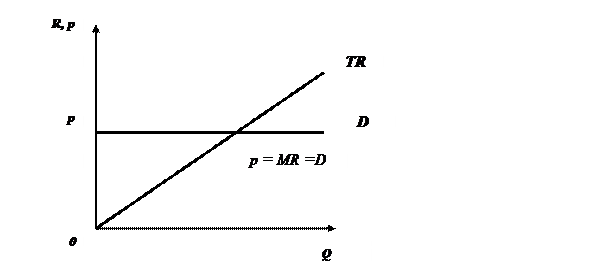 Рис. 4. Валовий дохід (виручка) В умовах досконалої конкуренції, коли виробників нескінченно багато, ніхто з них не може істотно вплинути на ціну вироблюваної продукції. Для фірм ціна складається об’єктивно, незалежно від їх волі і бажання, в результаті чого кожна з фірм виступає як ціноотримувач. Тому, якщо на осі абсцис відкласти кількість продукції, а на осі ординат – ціну, то їх взаємозв’язок відображається прямою, паралельною осі абсцис (рис. 5). З економічної точки зору це означає, що еластичність попиту за ціною є нескінченно великим. Рис. 5. Ціна, середній і граничний дохід в умовах досконалої конкуренції З’єднавши обидва графіки, ми отримаємо елементарні умови рівноваги для окремої фірми: перетин кривої граничного доходу з сукупною виручкою показує рівноважний обсяг виробництва за даною ціною (рис. 6).