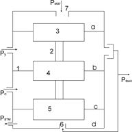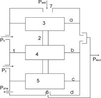 В сопло 7 подается Рпит, в камеру b подается Рподпора, в С подается Рупр. Давление подпоры Pn = (0, 3..0, 8)Рмаг.При подаче в камеру с Рупр сигнал управления x=1. Камера d соединена с атмосферой и с камерой a каналом. За выходной сигнал принимается сигнал на выходе Pвых. Если Рвых = Рмаг, то 1, если =Ратм, то 0. Эффективные площади центров 3, 4, 5 мембран соединены штоком. Соотношение активных площадей выполнено следующим образом: А3=А5, А4> А3, А4> А5. Действие реле зависит от давления Рn и Рy в камерах b и c. Если 0, то в камере с давление отсутствует и равнодействующая сил будет перемещать шток вниз, т.к. А4> А3 и жесткий центр 5 закроет сопло 6. Тогда в камере а установится давление Рмаг и выходной сигнал1. При подаче давления в камеру с равнодействующая сил переместит шток вверх и сигнал на выходе 0. Изменяя давление Pn и Py можно получать различные логические операции. Реализация операций повторения и умножения.