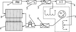 где 1-генератор импульсов, 2-делитель частоты(f1: f2=2000: 1), 3-преобразователь прямоугольного напряжения в синусоидальное, 4-звено, осуществляющее сдвиг фазы, 5-резольвер, 6-преобразователь напряжения, 7-звено, выделяющее фазу, 8-счетчик 11 бит, 9-регистр памяти.