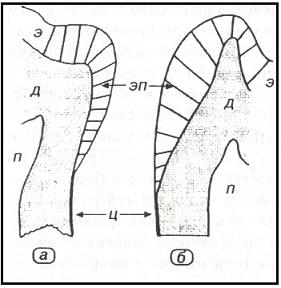 Ход эмалевых призм в коронке временного (а) и постоянного (б) зубов: э – эмаль; ЭП – эмалевые призмы; Д – дентин; Ц – цемент; П – пульпа (по B.J. Orban, 1976, с изменениями).