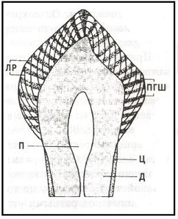 Полосы Гунтера-Шрегера и линии Ретциуса эмали: ЛР – линии Ретциуса; ПГШ – полосы Гунтера-Шрегера; Д – дентин; Ц – цемент; П – пульпа.