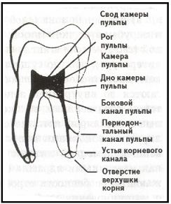 Дентин корня образует стенку корневого канала, открывающегося на его верхушке одним или несколькими апикальными отверстиями, которые связывают пульпу с периодонтом. Эта связь в корне часто обеспечивается также добавочными каналами, которые пронизывают дентин корня. Добавочные каналы выявляются в 20—30 % постоянных зубов; они наиболее характерны для премоляров, в которых определяются в 55 %. Во временных зубах частота обнаружения добавочных каналов равна 70 %. В молярах наиболее типично их расположение в межкорневом дентине, вплоть до пульпарной камеры. Дентин имеет светло-желтую окраску, обладает некоторой эластичностью; он прочнее кости и цемента, но в 4—5 раз мягче эмали. Зрелый дентин содержит 70 % неорганических веществ (преимущественно гидро-кисапатита), 20 % органических (в основном коллагена 1 типа) и 10 % воды. Благодаря своим свойствам дентин препятствует растрескиванию более твердой, но хрупкой эмали, покрывающей его в области коронки. Дентин состоит из обызвествленного межклеточного вещества, пронизанного дентинными трубочками, содержащими отростки одонтобластов, тела которых лежат на периферии пульпы. Между трубочками располагается интертубулярный дентин. Периодичность роста дентина обусловливает наличие в нем ростковых линий, расположенных параллельно его поверхности.