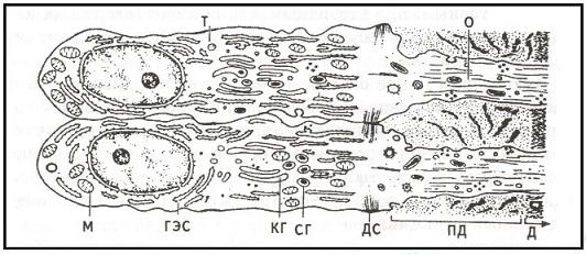 Ультраструктурная организация одонтобласта: Т – тело одонтобласта; О – отросток одонтобласта; М – митохондрии; ГЭС – гранулярная эндоплазматическая сеть; КГ – комплекс Гольджи; СГ – секреторные гранулы; ДС – десмосомы; ПД – предентин; Д – дентин.