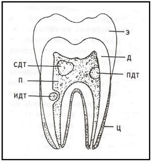 Дентикли в пульпе зуба: Э – эмаль; Д – дентин; Ц – цемент; П – пульпа; СДТ -свободный дентикль; ПДТ – париетальный дентикль; ИДТ – интерстициальный дентикль.
