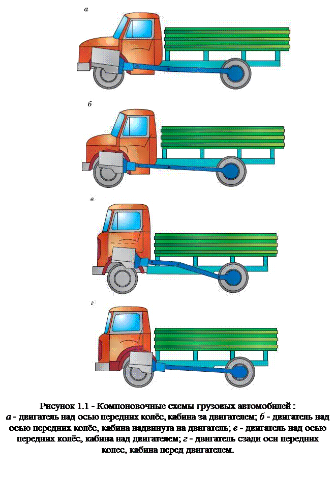 вратить вредное воздействие колебаний на водителя при такой компоновке сиденье водителя выполняют, как правило, с дополнительным подрессориванием. Схема г. Данная компоновка имеет определенные преимущества перед другими компоновками и вместе с тем ряд недостатков. Так, при этой компоновке можно получить низкий габарит по высоте при хорошей обзорности с места водителя, удовлетворительное распределение массы по осям. Однако в этом случае сложнее решаются вопросы доступа к двигателю и к коробке передач, ухудшаются показатели плавности хода, усложняется конструкция обслуживающих систем двигателя и приводов управления автомобилем и уменьшается длина грузовой платформы. Тем не менее, важные достоинства такой компоновки предопределили достаточно широкое ее применение на последних моделях грузовых автомобилей. В частности, такая общая компоновка применена на автомобилях «Татра», на новых автомобилях фирмы MAN грузоподъемностью 5, 7 и 10т, на некоторых большегрузных тягачах фирмы «Фаун», большегрузных многоосных автомобилях КамАЗ, МАЗ. К недостаткам следует отнести: затрудненный доступ к двигателю через люк в полу, который не исключает возможности попадания в кабину отработавших газов. Поэтому вместо применения закрываемого люка кабину иногда выполняют откидывающейся. Однако механизм откидывания усложняет конструкцию и коммуникации. Другим решением этой проблемы может быть применение двигателя с горизонтальным или противолежащим расположением цилиндров, установленного под рамой и доступного для обслуживания снизу. На автомобилях, выполненных по схемам в и г, в нагруженном состоянии на передние колёса приходится 33—35 % массы, что благоприятно при движении по дорогам с твёрдым покрытием; без нагрузки на задние колёса приходится менее 50 % массы, что затрудняет движение по бездорожью. В сравнении с автомобилями, выполненными по схемам а и б, база меньше на 900—1200 мм, а габаритная длина — на 700—1000 мм. Это обеспечивает высокую маневренность и минимальную потребную площадь для стоянки. Сухая масса автомобиля меньше на 100—150 кг. К числу недостатков схем в и г, по сравнению со схемами а и б, следует отнести расположение сидений далеко от зоны наибольшей комфортабельности, в следствии чего экипаж будет подвергаться воздействию больших вертикальных ускорений при продольных колебаниях автомобиля. Самым большим недостатком таких схем является плохая пассивная безопасность конструкции. Такие компоновочные схемы используют на легких, или, наоборот, очень тяжелых грузовых автомобилях.