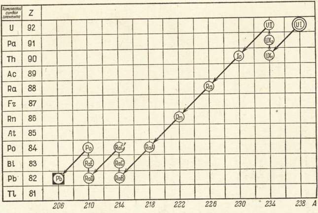 Рисунок 4. Урановый ряд радионуклидов А – массовое число ядра; Z – порядковый номер элемента в таблице Менделеева; кружки – радиоактивные изотопы; Pb – устойчивый изотоп; жирные наклонные стрелки - a-распад; тонкие вертикальные стрелки - b-распад