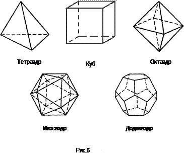 Таким образом, последовательность построения основания шестиугольной пирамиды такова (рис. 5): - изображают произвольный параллелограмм В'С'Е'F' и его диагонали; отмечают точку их пересечения О'; - через точку О' проводят прямую, параллельную В'С' (или Е'F'); - на построенной прямой выбирают произвольную точку А' и отмечают точку D' такую, что (О'D' = А'С', и соединяют точку А' с точками В' и F', а точку D' с точками С' и Е'. Чтобы завершить построение пирамиды, проводят вертикальный отрезок O'S (его длина выбирается произвольно) и соединяют точку S со всеми вершинами основания. Завершая рассмотрение многогранников, отметим еще их одно интересное свойство, установленное Л. Эйлером. Пусть дан выпуклый многогранник и b - число его вершин, р -число ребер, r - число граней. Тогда b - р + r = 2 для любого выпуклого многогранника. Например, правильная шестиугольная пирамида имеет 7 вершин (b = 7), 12 ребер (р = 12) и 7 граней (r = 7). Тогда b - р + r =7- 12+ 7 = 2. На основании теоремы Эйлера можно заключить, что существует пять и только пять видов правильных многогранников, т.е. таких выпуклых многогранников, у которых все грани - равные друг другу правильные многоугольники и в каждой его вершине сходится одно и то же число ребер. Это - тетраэдр, куб, октаэдр, икосаэдр, додекаэдр (рис. 6).