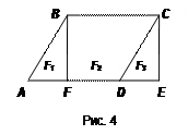 треугольники равны. Площадь каждого из них равна Если F - произвольный многоугольник, то его площадь находят, разбивая многоугольник на треугольники (или другие фигуры, для которых известны правила вычисления площади). В связи с этим возникает вопрос: если один и тот же многоугольник по-разному разбить на части и найти их площади, то будут ли полученные суммы площадей частей многоугольника одинаковыми? Доказано, что условиями, сформулированными в определении площади, площадь всякого многоугольника определена однозначно. Кроме равенства и равновеликости фигур в геометрии рассматривают отношение равносоставленности. С ним связаны важные свойства фигур. Многоугольники F1 и F2 называются равносоставленными, если их можно разбить на соответственно равные части. Например, равносоставлены параллелограмм АВСD и прямоугольник FВСЕ (рис. 4), так как параллелограмм состоит из фигур F1 и F2, а прямоугольник - из фигур F2 и F3, причем F1 = F3. Нетрудно убедиться в том, что равносоставленные фигуры равновелики. Венгерским математиком Ф.Бойяи и немецким любителем математики П.Гервином была доказана теорема: любые два равновеликих многоугольника равносоставлены. Другими словами, если два многоугольника имеют равные площади, то их всегда можно представить состоящими из попарно равных частей. Теорема Бойяи-Гервина служит теоретической базой для решения задач на перекраивание фигур: одну разрезать на части и сложить из нее другую. Оказывается, что если данные фигуры многоугольные и имеют одинаковые площади, то задача непременно разрешима.