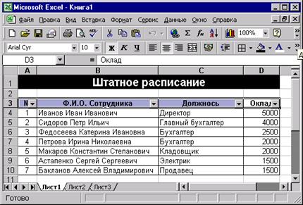 Фильтрация данных – процесс выборки данных из информационного массива (таблицы или списка) на основе заданных условий отбора. При этом данные как бы «просеиваются» через налагаемые на них условия. Самым простым видом фильтрации является Автофильтр. Для активации механизма автофильтрации таблицы необходимо: 1. Выделить шапку таблицы. 2. Д анные ® Ф ильтр ® А втофильтр … После этого шапка таблицы примет вид как показано на рисунке.