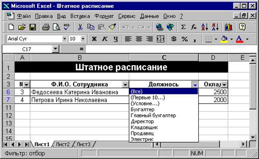 Таким образом, получим результат выборки – отфильтрованную таблицу. Номера строк, окрашенные синим цветом показывают, что табличная информация полученная на экране является результатом фильтрации, т.е. выборкой по определенным критериям. В графе, на значения которой наложены ограничения, кнопка установки условия окрашивается в синий цвет. Если необходимо ввести дополнительные ограничения (например, по окладу). Для того, чтобы снять наложенные ограничения – отменить фильтрацию, необходимо вызвать список установки критериев отбора и выбрать элемент «Все» для снятия наложенных на значение ячеек столбца ограничений (см. рис. ниже).