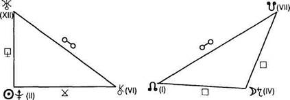 Если внимательно присмотреться к прогрессирующей карте (с. 280), то можно обнаружить 2 замкнутые ситуации, одна из которых включает в себя кармические аспекты.