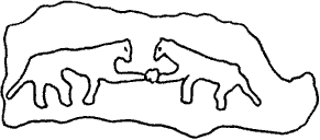 Тринадцать лет назад автору этой книги, занимавшемуся изучением абхазского язычества, посчастливилось с помощью проводника — старого абхазца, прокладывавшего через заросли дорогу топориком, подняться на вершину горы над Ткварчели, где в средние века был построен христианский храм на месте поклонения этому божеству. На мраморной плите на одной из стен храма божество изображено в виде двух фантастических животных (собак), соединяемых каким-то круглым предметом (рис. 30). Возле этой плиты в глухом месте среди зарослей я с изумлением увидел следы недавно совершенного жертвоприношения (хотя уже достаточно скромного). Кажется возможным, что в искусстве палеолита символы лошади и бизона, входившие в ряды двоичных противоположностей, могли быть связаны с древней формой близнечного мифа, возводящей родоначальников племени к парным животным. Противоположение мифологического мужского и женского начал в разных образах первобытного искусства выражается либо символами животных (лошади и бизона), либо условными знаками (стилизованными изображениями пола, пунктирными линиями, треугольниками, четырехугольниками и т. п.). Возможно, что с символикой женского начала, особенно важного для религии палеолита, следует связывать и многочисленные палеолитические скульптурные изображения «венер»— женские фигурки (часто с гипертрофией женских половых признаков — громадными грудями). С женским и мужским началом связаны и символы Луны (Месяца) и Солнца. Эти два символа также восходят уже к верхнепалеолитическому искусству. К палеолиту возводится и распространенный во многих мифологических традициях Евразии образ Луны как быка (бизона) и Солнца как лошади. Противопоставление лошади и бизона в таких памятниках первобытного искусства, как рисунки на стенах пещер Ляско, соотнесено не только с различиями левой и правой стороны, красного и черного цветов, но и с различием между четом и нечетом. На рисунках в пещерах Ляско к семи основным «счетным» знакам у лошади добавляется одна стрелка (всего 8, чет), у бизона две стрелки (всего 9, нечет). Противопоставление чета и нечета найдено и в целом ряде других произведений первобытного искусства [69]. Для пояснения возможностей древней обрядовой роли этого противопоставления значительный интерес может представить сравнение с древнекитайскими ритуалами. Согласно мнению некоторых историков китайской культуры, самое деление явлений на две полярно противоположные группы — ян и инь — было связано с необходимостью при гаданиях относить каждое событие к одной из двух категорий — благоприятной или неблагоприятной. Результат деления чисел, получившихся при гадании, мог быть четным или нечетным, в зависимости от чего определялся благоприятный или неблагоприятный исход гадания. Кажется вероятным, что счетные знаки на произведениях палеолитического искусства могли быть связаны с осуществлением сходных обрядов.
