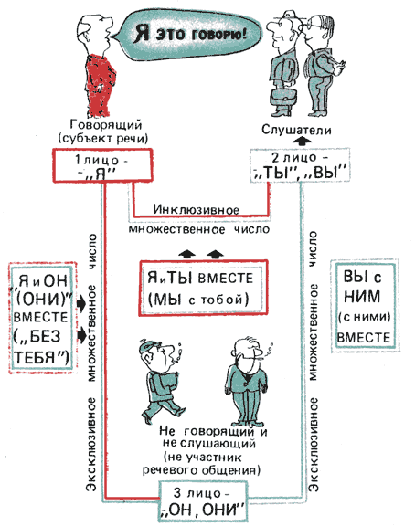 Во многих языках мира есть особые формы первого лица множественного числа, обозначающие говорящего вместе со слушателем: мы (называемое «инклюзивным» или «включающим») в смысле я и ты вместе, мы включая и тебя тоже (рис. 37). Такое первое лицо множественного числа, включающее (или инклюзивное), отличается от первого лица множественного числа, которое обозначает говорящего вместе с другими людьми, но не включает второго участника акта речевого общения, — слушающего (множественное число «эксклюзивное» или «исключающее»). Известен рассказ о миссионере, который неудачно пытался обратить членов одного африканского племени, начав со слов: Мы все грешники, и мы все нуждаемся в обращении в веру, но, говоря на языке этого племени, употребил вместо «включающей» формы множественного числа форму «исключающую» и поэтому слушатели его должны были понять так: Я и мои близкие (но не вы — мои слушатели), мы грешники, и я и все мои близкие, мы (но не вы — мои слушатели) нуждаемся в обращении в веру. Разница между инклюзивными и эксклюзивными формами в русском языке обнаруживается в некоторых случаях в глаголе. Пожелание Отдохнем! является инклюзивным, оно относится одновременно и к говорящему, и к слушающему, тогда как Отдохни! обращено только к слушающему. Точно так же Пойдемте! является инклюзивным обращением (к себе самому и к группе слушающих или к одному слушающему, если к нему обращаются вежливо на Вы), а Пойдите! — форма, обращенная к слушающему (или слушающим). Если первые два лица в естественных языках обозначают участников речевого общения, то формы третьего лица (а отчасти и формы эксклюзивного множественного числа) относятся, как правило, к тому человеку или тем людям, которые не участвуют в речевом общении. Третье лицо по своему значению определяется отрицательно: тем, что человек (или люди) не участвует в речевом общении, не является ни говорящим (первым лицом), ни слушающим (вторым лицом). С этим значением третьего лица согласуются и особенности его выражения во многих языках, где оно в глаголе часто обозначается отсутствием какого бы то ни было окончания в отличие от первого и второго лиц, имеющих особые окончания. Естественные языки различаются лишь тем, как в них выражается лицо: в глаголе (как это обычно в большинстве языков мира), в личном местоимении или же в каких-либо других формах. В русском предложении я думаю лицо (первое, указывающее на то, что мыслит говорящий — субъект речи, являющийся одновременно и сознающим себя субъектом мысли) выражено личным местоимением (я) и окончанием глагола (дума-ю). В аналогичном латинском предложении cogito (я мыслю) нет необходимости в выражении лица посредством особого личного местоимения: латинское личное местоимение ego (я) может быть добавлено только для усиления (например, чтобы передать смысл именно я, а не кто-нибудь другой). В английском I think (я мыслю) лицо выражено только местоимением, что видно из противоположного ему you think (ты дума-ешь). Этим объясняется разница между латинским изречением Декарта cogito ergo sum (я мыслю, следовательно, я существую), где союз ergo связывает две глагольные формы первого лица, и английским переводом этой фразы I think, therefore I am, в котором при каждом сказуемом — глаголе в форме первого лица (мыслю, существую) ставится подлежащее — личное местоимение первого лица, как и в обыч