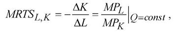 где ∆ K и ∆ L – изменения капитала и труда для отдельной изокванты (Q = const), MРL и MРК – предельные продукты труда и капитала. MRTSL, K характеризует степень взаимозаменяемости труда и капитала в конкретном производстве и отображается наклоном касательной к соответствующей изокванте. Чем больше MRTSL, K, тем больше роль труда в производстве. Таким образом, изокванта – это графическое изображение производственной функции.