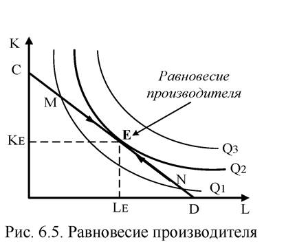 Свойства изокосты (рис. 6.4): 1) точки D и С – максимальный расход труда и капитала соответственно; 2) наклон изокосты к осям координат определяется соотношением цен труда и капитала tgα =|-w/r|= MRTSL, K 3) при изменении бюджета (Δ С) изокоста CD сдвигается параллельно самой себе (при ↑ С → C’D’, при ↓ С → C”D”); 4) при изменении цен на ресурсы (Δ w, Δ r) изменяется угол наклона изокосты, например, при ↓ w → CD’”. Равновесие производителя возникает, когда он максимизирует выпуск продукции при данных общих расходах на ресурсы. Графически – это точка касания изокосты (CD) и изокванты (Q2) (точка Е(LЕ, КЕ) на рис. 6.5).