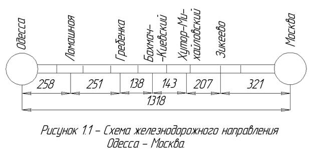 Способ перевозки СПГ (с охлаждением, отоплением, без охлаждения и отопления, с вентилированием и без него) и вид подвижного состава выбирают в зависимости от вида и термической обработки груза, периода года, климатической зоны направления перевозки с учетом ограничения по использованию отдельных типов изотермических вагонов и необходимости снижения расходов на перевозку при одновременном обеспечении сохранности грузов. Правилами перевозок грузов год условно делится на три периода: летний, переходный и зимний. Направление перевозки Одесса - Москва проходит через Одесскую, Южную, Юго-Западную и Московскую железные дороги. На этих дорогах разные климатические условия: 1. Одесская: · летний период – апрель-ноябрь включительно · переходный период – декабрь и март · зимний период – январь-февраль включительно 2. Южная: · летний период – апрель-ноябрь · переходный период – декабрь и март · зимний период – январь-февраль 3. Московская: · летний – май-октябрь включительно · переходный – ноябрь и апрель · зимний – декабрь-март включительно Для определения дальности перевозки и климатических зон направления составляется схема железнодорожного направления по кратчайшему маршруту Одесса-Москва.