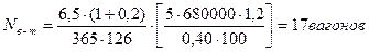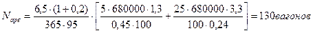 b - коэффициент, учитывающий нахождение вагонов в ремонте, в резерве МПС (b=0, 2); Vj - погрузочный объем j-типа вагона, м3; Для пятивагонной секции V=400м3; Для АРВ V=95м3; Для крытого V=80м3; m - количество видов груза, перевозимых j-типом подвижного состава; Gi - годовой объем погрузки i-го груза, т; Pj - процент i -го груза, перевозимого j-м типом подвижного состава; Кi - коэффициент неравномерности перевозок i-го груза.