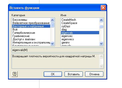 Эта однородная система линейных уравнений имеет решения для конкретных значений - λ 1, λ 2, …., которые называются собственными числами матрицы системы А. Каждому собственному числу соответствует собственный вектор – х1, х2, ….., который является решением системы для данного собственного числа. Таким образом, для того, чтобы знать полный набор решений, необходимо определить собственные числа матрицы системы и найти для них соответствующие собственные векторы. Для решения таких задач на собственные числа и собственные векторы существует несколько встроенных функций, реализующих достаточно сложные вычислительные алгоритмы: - eiganvals(A) – вычисляет вектор собственных чисел; - eigenvecs(A) – вычисляет матрицу, содержащую нормированные собственные векторы, каждый столбец включает в себя координаты одного собственного вектора, количество столбцов равно количеству собственных чисел; - eigenvec(A, λ) – вычисляет один собственный вектор для заданного собственного числа. Доступ к этим функциям осуществляется через панель инструментов и диалоговое окно (рис.16):