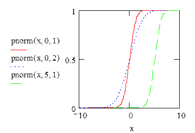 Рис.17 Перечислим встроенные функции, которые рассчитывают числовые характеристики этого распределения: - dnorm(x, m, σ) – плотность вероятности нормального распределения (рис.18); - pnorm(x, m, σ) – функция нормального распределения (рис.19); - cnorm(x) – фунция нормального распределения с нулевым математическим ожиданием и единичной дисперсией; - qnorm(F, m, σ) – обратная функция нормального распределения; - rnorm(M, m, σ) – вектор М независимых случайных чисел, каждое из которых имеет нормальное распределение. x – значение случайной величины; Р – значение вероятности; m – математическое ожидание; σ – среднеквадратичное отклонение.