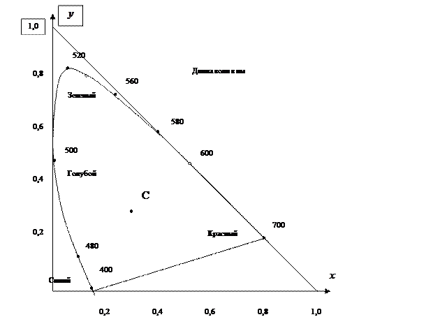 Каждая точка в нем представляет определенную цветность. На рисунке в частности можно показать линию, на которой располагаются цветности монохроматических (спектральных) цветов. Рассматриваемый треугольник равносторонний, удобнее же пользоваться прямоугольным, поэтому его проектируют на плоскость ХОY так, чтобы точка (z=1, x=0, y=0,) совпала с 0. В результате получается широко известный цветовой график МКО, который обладает следующими особенностями. 1. Координаты цветности (трехцветные коэффициенты) x и y образуют прямоугольную систему координат. 2. На линии 0 x расположены цвета с нулевой яркостью (y=0 т.е. Y =0). Однако это не значит, что координата 3. Абсолютно чистые цвета спектра лежат на криволинейной границе, где указываются их длины волн. Внутри и на границе подковообразной области содержатся все видимые цвета, при этом, все воспринимаемые цвета, имеющие одинаковую цветность, но различные яркости, отображаются в одну точку внутри области. 4. Опорный белый цвет, являющийся аппроксимацией солнечного цвета располагается вблизи точки с координатами x c = y c = z c = 1/3.