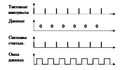 В режиме записи сигналы синхронизируются импульсами тактового генератора. При считывании скорость вращения может изменяться, поэтому синхронизация нарушается. Тем не менее при ЧМ – методе сохраняются тактовые импульсы в считываемом сигнале. Поэтому легко сформировать окна данных, синхронизированные с тактовыми импульсами. При записи МЧМ или RLL – методами в считываемых сигналах практически отсутствуют тактовые импульсы, поэтому схема сепаратора данных существенно усложняется. Для обеспечения ее работы вначале индексного поля, идентификатора и поля данных записывается код синхронизации. Этим кодом служат данные (00)16 длиной 12 байт. Сигналы, считываемые с этих участков, принимаются за тактовые импульсы. С их помощью формируются окна данных, синхронизированные с тактовыми импульсами.