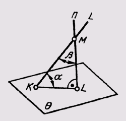 Рис. 143 фронталь f Проекция MI совмещения вершины М угла между прямыми с и d находится на проекции Sum 2 фронтально проецирующей плоскости Sum, в которой вращается точка М. Определив с помощью прямоугольного треугольника О2М2М натуральную величину радиуса вращения r и отложив ее на проекции Е2 от фронтальной проекции центра вращения, получаем изображение точки М на плоскости П2в совмещенном с плоскостью Ф положении. Соединяя фронтальные проекции неподвижных точек 1 и 2 с построенной точкой М, получаем проекции с2 и d2, совмещенных с плоскостью Ф прямых с и d. Угол между прямыми с2 и d2 определяет натуральную величину искомого угла между пересекающимися прямыми с и d. Эта задача также может быть решена способом замены плоскостей проекций. Для этого двойной заменой плоскостей проекций нужно сделать плоскость угла плоскостью уровня, решив последовательно сначала третью исходную задачу, а затем — четвертую. Натуральная величина угла между скрещивающимися прямыми определяется как угол между двумя пересекающимися прямыми, параллельными данным скрещивающимся прямым. Угол а между прямой l и плоскостью 6 может быть определен через дополнительный угол р между заданной прямой l и перпендикуляром п к данной плоскости, проведенной из любой точки прямой (рис. 144). Угол Р дополняет искомый угол а до 90°. Определив истинную величину угла Р путем вращения вокруг прямой уровня плоскости угла, образованного прямой l и перпендикуляром и, остается дополнить его до прямого угла. Этот дополнительный угол и даст истинную величину угла а между прямой l и плоскостью 0. Истинная величина двугранного угла — между двумя плоскостями Q и л. — может быть определена или путем замены плоскости проекций с целью преобразования ребра двугранного угла в проецирующую прямую (задачи 1 и 2), или если ребро не задано, как угол между двумя перпендикулярами n1 и n2, проведенными к данным плоскостям (см. § 61) из произвольной точки М пространства (см. рис. 145). В плоскости этих перпендикуляров при точке М получаем два плоских