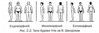 В основу своєї класифікації Вільям Шелдон (1899- 1977) поклав переважання в людському організмі однієї з тканин ембріона: ендодерми, з якої утворюються органи травлення; мезодерми, з якої складаються кістки, м'язи і легені; ектодерми, з якої утворюються шкіра, волосся, нігті, нерви і мозок. Проаналізувавши 4000 фотографій оголених студентів коледжу і провівши кореляційний аналіз між ознаками зовнішності і 50 поведінковими характеристиками, він запропонував розрізняти такі типи особистості: ендоморфний, мезоморфний і ектоморфний (рис. 2.2). Ендоморфний тип (з великим животом, значними жировими відкладеннями на плечах і стегнах, слабкими кінцівками) проявляє схильність до вісцеротонії (лат. viscera - нутрощі і грец. tonos - напруга). Він товариський і поступливий, привітний, любить комфорт, легко виражає свої почуття. У важкі хвилини прагне спілкування. Не любить напруги, а в стані сп'яніння стає чулим і м'яким. Мезоморфний тип (могутня статура, груди " колесом", квадратна голова, широкі долоні і ступні) схильний до соматотонії (soma - тіло і tonos - напруга). Це люди неспокійні, нерідко агресивні, полюбляють пригоди. Досить потайливі у почуттях і думках. У поставі й діях цей тип виражає впевненість, складні життєві ситуації прагне вирішувати поведінково, через зміну світу навколо себе. У стані сп'яніння такі люди настирливі й агресивні. Ектоморфний тип (худорлявий і високий, зі слабо-розвиненими внутрішніми органами, худим обличчям, вузькою грудною кліткою, тонкими довгими кінцівками) звичайно відрізняється церебротонією (лат. cerebrum - мозок і грец. tonos - напруга). Це люди загальмовані й інтровертні, нетовариські, потайливі. У їхній поставі відчувається скутість. У важких ситуаціях схильні до самоти. Найпродуктивнішим і щасливим для них переважно виявляється пізній період життя. Під дією алкоголю практично не змінюють своєї звичайної поведінки і стану.