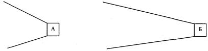Рис. 5. Сприймання величини предмета залежно від кута конвергенції (предмет А сприймається більшим і ближчим, ніж предмет Б) Зі сприйманням величини предметів тісно пов'язане сприймання відстані до них. Ми легко визначаємо розмір предмета, знаючи, на якій відстані від нас він знаходиться і, навпаки, знаючи величину предмета, легко сприймаємо відстань до нього. Здатність людини за допомогою зору сприймати та оцінювати відстань та розмір предметів називають окоміром. Специфічним механізмом, який забезпечує сприймання відстані до об'єктів, є монокулярний паралакс руху — якщо об'єкти переміщаються відносно спостерігача або спостерігач відносно об'єктів, то ближчі і дальші точки переміщаються у різних напрямках — ближчі у протилежному щодо спостерігача, а дальші у тому ж, що і спостерігач. Цей ефект можна спостерігати з вікна поїзда, що рухається. До сприймання простору відноситься також сприймання об'ємності (рельєфності, глибини) об'єктів, тобто їхнього третього виміру. Механізмом, який забезпечує відображення об' ємності, є бінокулярний та монокулярний стереоефекти. Бінокулярний стереоефект — це об'ємне сприймання навколишніх предметів, яке забезпечується просторовою розбіжністю між зображеннями, які виникають на сітківках обох очей. Монокулярний стереоефект полягає в об'ємному сприйманні навколишніх предметів за рахунок кінетичного ефекту глибини: якщо тіньові двомірні фігури обертати з певною швидкістю, вони починають сприйматися як об'ємні. Важливою складовою сприймання простору є сприймання напрямку, в якому знаходяться об'єкти. Цей напрямок визначається місцем зображення об'єкта на сітківці та положенням нашого тіла по відношенню до оточуючих предметів. При бінокулярному зорі напрямок предмета визначається законом тотожнього напрямку. За цим законом подразники, які потрапляють на кореспондуючі точки сітківки, бачимо як такі, що знаходяться в одному напрямку. Цей напрямок задає лінія, яка з'єднує точку перетину зорових осей обох очей з точкою, що знаходиться посередині відстані між очима. Сприйняти напрямок об'єктів допомагає також слуховий та нюховий аналізатори. Так, напрямок звуку сприймається за допомогою бінаурального слухання (це різниця у часі подання сигналів в кору великих півкуль від правого та лівого вуха) і поворотів голови людини. При зоровому сприйманні простір не завжди відображається адекватно. Відомі численні випадки зорових ілюзій (від лат. illusion — помилка, оманливе уявлення), тобто хибного сприймання простору. Зорові ілюзії можуть бути пов'язані з впливом фону сприймання, найближчого оточення і вертикального напрямку. Ілюзії, пов'язані з впливом фону сприймання.