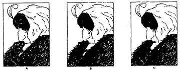 Рис. 19. Цілісне сприймання трикутника При слуховому сприйманні, незважаючи на те, що мелодію виконують на різних інструментах, ми її сприймаємо як одну й ту саму, хоча окремі елементи цілого (звуки) мають різну висоту та тембр. З наведеного вище випливає, що людина при сприйманні надає перевагу не окремим елементам, а їхній цілісній структурі. * Константність (від лат. constans — незмінний) — це відносна сталість властивостей предметів, що сприймаються, при зміні умов сприймання. Оточуючі нас об'єкти та явища постійно змінюють свої обриси по відношенню до людини, бо все у світі перебуває в русі. Отже, інформація, яку отримують відповідні сенсорні системи, щохвилини інша. За таких умов було би надзвичайно важко орієнтуватися у постійно змінному світі. Тому в ході еволюції сформувалась можливість нашої перцептивної системи компенсувати ці зміни і в результаті цього зберігати відносно постійний образ сприймання та стабільність навколишнього світу. У психології описані константність сприймання форми, величини, кольору та яскравості. Константність сприймання форми демонструється наступним дослідом. Якщо ми будемо поступово нахиляти круг, його зображення на сітківці ока буде змінюватись, поступово приймаючи вигляд овалу або прямокутника. Однак, на запитання, якої форми предмет, людина ще довго відповідає, що це круг. Таким чином, завдяки константності сприймання форми, відбувається корекція зображення на сітківці. Константність сприймання величини об'єктів можна продемонструвати за допомогою наступних дослідів. Якщо з балкону театру дивитися на глядачів, то всі обличчя здаються нам майже однаковими за величиною, незважаючи на те, що вони знаходяться на різній відстані від нас, отже, зображення на сітківці різне. Подібне спостерігається при сприйманні кольору. Відомо, що вугілля, яке знаходиться в яскраво освітленому приміщенні, відображає більше світла, ніж білий папір у сутінках. Однак, ми продовжуємо сприймати вугілля як чорне, змінюючи безпосередній образ сприймання. Константність як особливість сприймання пояснюється тим, що відбувається корекція образу, який виникає на сітківці ока. Хоча ця властивість сприймання і виробилась у ході еволюції, сама вона не є вродженою, а формується в результаті набування індивідуального досвіду завдяки активній дії перцептивної системи. Апперцепція (від лат. ad — до; perceptio — сприймання) — це залежність змісту та спрямованості сприймання від досвіду, інтересів, ставлення до життя, установок та індивідуально-типологічних особливостей особистості. Процес сприймання тісно пов'язаний з пожвавленням минулого досвіду людини, бо нова інформація, яка отримується в результаті цього психічного процесу, зіставляється з існуючою. Це відбувається, зокрема, тому, що сприймає не ізольоване око чи вухо, а конкретна людина з притаманними лише їй потребами, почуттями, індивідуально-типологічними особливостями. Є два види апперцепції: стійка та тимчасова. Стійка апперцепція — це залежність сприймання від стійких особливостей особистості, наприклад, від освіти, переконань, світогляду тощо. Тимчасова апперцепція — це залежність сприймання від ситуативних психічних станів людини, наприклад, емоцій, установок тощо. Особливу роль у тимчасовій апперцепції мають установки особистості. Осмисленість сприй