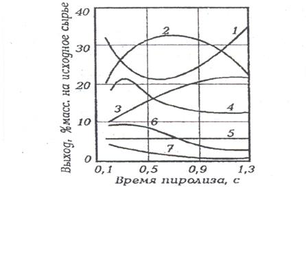 Рисунок 2 - Кинетика образования основных продуктов пиролиза углеводородной фракции 85 – 120° С при 810° С и атмосферном давлении: 1 – жидкие продукты пиролиза; 2 – этилен; 3 – метан; 4 – пропилен; 5 – этан; 6 – бутадиен; 7 – бутен