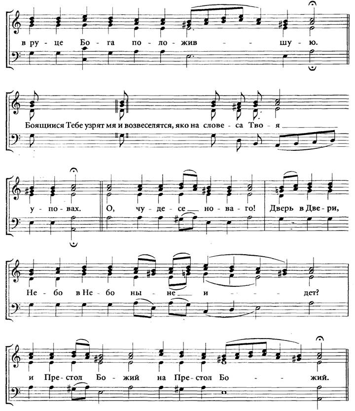 Разуме́ х, Го́ споди, яко пра́ вда судьбы́ Твоя // и вои́ стинну смири́ л мя еси. Ста и удивися все множество Ангелов, зряще Христа Бога неприступнаго, приступающа к Матери, честь Ей воздающа. Бу́ ди же ми́ лость Твоя, // да уте́ шит мя, по словеси́ Твоему́ рабу́ Твоему́. Ужасеся, Бога трепетно зряще, низходящаго паки, и душу на руце приемлющаго, и возшедшаго во славе Божественней. Да прии́ дут мне щедро́ ты Твоя́, // и жив буду, яко зако́ н Твой поуче́ ние мое есть. Ужаснися, Небо, и ты, земле, внуши глаголы: Бог, Иже над всеми, первее сниде и ныне второе на землю ради Матере.