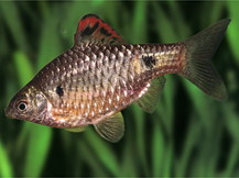 БАРБУС АЛЫЙ (Barbus ticto H. -B., 1822), рыба семейства карповых, обитает в водоемах Индии, Шри-Ланки. В Европу завезен в 1903 году. Другое название — барбус тикто, или одесский барбус. Тело плотное, вытянутое, длиной до 10 см. Окраска самцов розовая. Спинной плавник имеет темные крапины, брюшные плавники красные. Позади жаберной крышки и у основания хвостового стебля отчетливые темные пятна. Самцы мельче, стройнее и ярче самки. Рыба мирная, стайная, но лучше алых барбусов не держать с малоподвижными рыбами, у которых они могут обкусывать плавники. Плавает в средних слоях. Для содержания необходим просторный аквариум не менее 50 л с большим пространством для плавания и затененными местами из плавающих растений. Необходимы аэрация и фильтрация воды, а также еженедельная подмена. Температура воды 21-25°С, жесткость до 17°, pH 6, 5-7, 0. Употребляют любой живой и сухой корм. Для нереста необходим аквариум объемом не менее 20 л, оборудованный фальш-дном из пластиковой сетки, которое засажено мелколистными растениями. Температура 27°С, жесткость около 6°, pH 6, 8. Плодовитость до 400 икринок. После нереста производителей необходимо отсадить. По окончании инкубационного периода, который длится одни сутки, появляются личинки, превращающиеся спустя 3-4 дня в мальков. Мальков выкармливают инфузориями, науплиями артемии. Формой, производной от алого барбуса, считается одесский барбус неяркого зеленовато-коричневого цвета с пятнистыми плавниками (кроме хвостового). Во время нереста у самцов вдоль тела тянется яркая красная полоса. Близким видом (по другим данным, подвидом) является барбус тикто столичка, у которого имеется ярко-красный спинной плавник с черными пятнами.