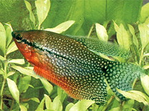 ГУРАМИ ЖЕМЧУЖНЫЙ (Trichogaster leeri Bleeker, 1852), рыба семейства макроподовых. Обитает в водоемах Малайского полуострова, Таиланда, на островах Суматра и Борнео. В Европе разводится с 1933 года. Впервые завезен в Россию в 1947 году. Тело вытянутое, овальное, сжатое с боков, до 11 см в длину. Первый луч брюшных плавников вытянут в длинную тонкую нить. Основной фон кремовый, а все тело и полупрозрачные плавники покрывают многочисленные переливающиеся светлые пятна, напоминающие жемчужины (отсюда название). Вдоль тела проходит черная полоса, начинающаяся от рыла и оканчивающаяся у основания хвостового плавника черным пятном. Самцы стройнее и ярче самок, особенно в период ухаживания и нереста, их спинной плавник остроконечно вытянут, анальный плавник мощный, с бахромчатыми вытянутыми лучами. Горло, брюшко и передний край анального плавника у самцов оранжевые или кроваво-красные. Мирная рыба, пригодная для содержания в обществе крупных спокойных рыб. Содержат в аквариумах емкостью около 70 л, с темным грунтом, засаженном растениями, в том числе плавающими, с солнечным освещением по утрам. Температура 23-27°С, жесткость до 12°, рН 6, 0-7, 0. Употребляют живой и сухой корм, растительные подкормки. Нерест парный. Нерестовик объемом не менее 70 литров, с уровнем воды 30-35 см, засаженный растениями, в том числе плавающими. Температура воды 27—28°С, жесткость до 8°, рН 6, 5-7, 5. Стимулом к нересту является замена 1/3 воды на дистиллированную и подъем температуры до 29-30°С. Первым сажают самца, который строит пенное гнездо на поверхности воды. Плодовитость до 1200 икринок. После икрометания самку отсаживают. Икринки имеют значительное содержание жира и во время нереста всплывают к поверхности. Инкубационный период 1-2 дня. Гнездо охраняет самец, но его следует отсадить, когда мальки начнут плавать. Мальков выкармливают живой пылью, инфузориями, вареным яичным желтком, коловратками, позднее — науплиями артемии, мелкими науплиями циклопов.