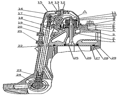 1 — головка цилиндра; 2 — втулка направляющая; 3 — шайба пружин клапана; 4, 5 — пружины клапана; 6 — манжета клапана; 7 — шайба; 8 — болт крепления головки; 9 — тарелка пружин; 10 — втулка тарелки пружин; 11 — сухарь клапана; 12 — болт крепления крышки; 13 — шайба; 14 — шайба виброизоляционная; 15 — крышка головки цилиндра; 16 — коромысло клапана; 17 — стойка коромысел; 18 — прокладка крышки; 19 — штанга; 20 — ввертыш крепления впускного коллектора; 21 — ввертыш крепления водяной трубы; 22 — прокладка уплотнительная; 23 — толкатель; 24 — распредвал; 25 — пРИЛОЖЕНИЕ В