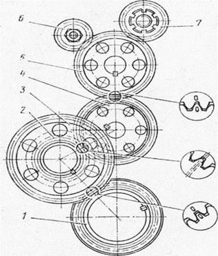 1 — ведущая шестерня коленчатого вала; 2, 3 — промежуточные шестерни; 4 — шестерня распределительного вала; 5 — шестерня привода топливного насоса; 6 — шестерня привода насоса гидроусилителя руля; 7 — шестерня привода компрессора.