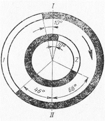 I — верхняя мертвая точка (ВМТ); II — нижняя мертвая точка (НМТ); 1 — впуск; 2 — выпуск.