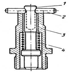 1 — фиксатор; 2 — штифт; 3 — корпус; 4 — пружина