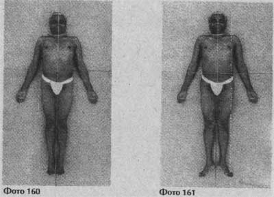 9. Прижмите верхушку каждой лопатки к полу (фот- 163 и 164), Расправьте кожу верхушки грудной клетки от ключиц к лопаткам и отрегулируйте положение спины, так чтобы правильно расположиться на подстилке (фот. 165). Следите за тем, чтобы спинной и поясничный отделы позвоночника располагались равномерно с обеих сторон и ребра расширялись одинаково в обе стороны. Около девяноста девяти процентов людей не располагаются равномерно на обеих ягодицах, а преимущественно на одной из них Проведите линии между сосками, плавающими ребрами, (фот 160 и 161) и тазовыми костями и добейтесь того, чтобы они были параллельными полу.